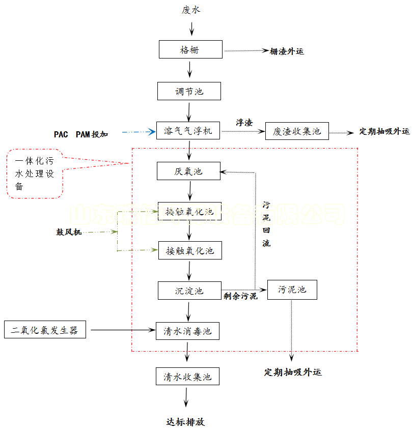 廢水首先經(jīng)過機械格柵進入處置系統(tǒng),格柵可以去除廢水中較大粒徑的懸浮物、漂浮物、皮毛、肉屑、骨屑、血污等雜質(zhì),出水進入隔油調(diào)理池,此池前部為隔油池,去除廢水中部分油脂,后部為調(diào)理池,對水量及水質(zhì)中止調(diào)理。調(diào)理池出水由提升泵提升至氣浮池,氣浮采用一元化氣浮裝置,它由池體,溶氣罐、空壓機及回流水泵組成,由一個電控箱中止控制操作。廢水中有大批的粗大懸浮物及油脂,經(jīng)過氣浮裝置的處置可大大降低上述污染物濃度,在氣浮設(shè)備義務(wù)時參與高分子絮凝劑,廢水經(jīng)加藥反響后進入氣浮池內(nèi),與經(jīng)過TJ型釋放器釋放的氣泡充分混合接觸,使水中的絮凝體粘附在宏大氣泡上,釋放的氣泡平均直徑Φ30um左右,絮體浮向水面構(gòu)成浮渣,浮渣聚集到一定厚度后,由刮渣機刮入氣浮泥槽道送到污泥濃縮池,氣浮池下層的清水一部分經(jīng)溶氣泵抽送供溶氣水運用,剩余的清水經(jīng)過溢流管進入后續(xù)處置單元。氣浮可以去除80—90%的懸浮物和40—50%的CODcr。同時,由于在氣浮池內(nèi)參與了混凝劑,與廢水中的磷酸鹽反響,生成更難溶于水的鹽類,從而將廢水中的磷較好的去除,添加了后續(xù)除磷處置單元的負(fù)荷。